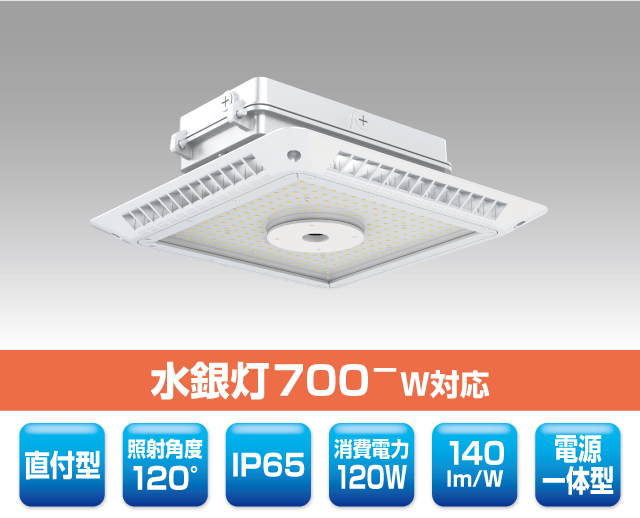キャノピー灯型LED照明(直付型) 180104 最終更新日時 : ミヤデン キャノピー灯型LED照明 品番:YRS120W-GSCP-D-B 製品仕様 GS-CP series ● N:昼白色 YRS120W-GSCP-D-B/N 消費電力 : 120 W入力電圧 : AC 100 ~ 277 Vサイズ : 365.9 × 365.9 × 127.8 mm質量 : 7.12 kg設計寿命 : 50,000 h色温度 : ●N 5,000K演色性 : Ra80使用温度 : -40 ~ 50°C保護等級 : IP65照射角度 : 120°全光束参考値: ●N 16,800 lm雷サージ : 20 KV製品保証 : 5 年工事保証 : 6 ヶ月 製品仕様書 株式会社ユアーズ・トレード「製品情報」、https:www.yrstrade.com/prodacts、(参照 2025-12)