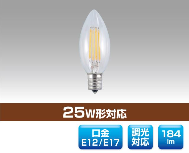 シャンデリア球型LED電球 0804 最終更新日時 : ミヤデン LED電球 品番:YRS-S2.3-DM-E 製品仕様 ● L:電球色 YRS-S2.3-DM-E/L 消費電力 : 2.3 W入力電圧 : AC 100 V対応口金 : E12 / E17サイズ : φ 35 × 98 mm質量 : 14 g設計寿命 : 20,000 h色温度 : 2,700K調光率 : 15 ~ 100 %演色性 : Ra80使用温度 : -20 ~ 40°C全光束参考値: 184 lm調光 : 対応製品保証 : 3 年 製品仕様書 株式会社ユアーズ・トレード「製品情報」、https:www.yrstrade.com/prodacts、(参照 2025-11)
