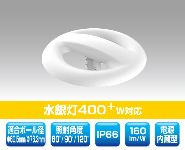 公園ポール灯対応LED照明 1702 最終更新日時 : ミヤデン 公園ポール灯対応LED照明 品番:YRS80W-PKC-C 製品仕様 ● N:昼白色 YRS80W-PKC-C/N 消費電力 : 80 W入力電圧 : AC 100 ~ 240 Vサイズ : φ 380 × 162 mm質量 : 4.0 kg設計寿命 : 50,000 h色温度 : ●N 5,000K演色性 : Ra80使用温度 : -40 ~ 60°C保護等級 : IP66照射角度 : 60° / 90° / 120°全光束参考値: ●N 12,800 lm適合ポール径: φ 60.5 mm φ 76.3 mm製品保証 : 5 年 製品仕様書 株式会社ユアーズ・トレード「製品情報」、https:www.yrstrade.com/prodacts、(参照 2025-11)