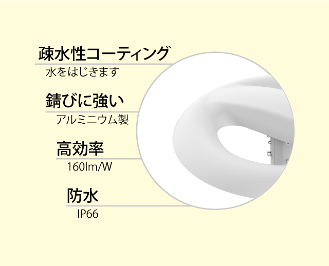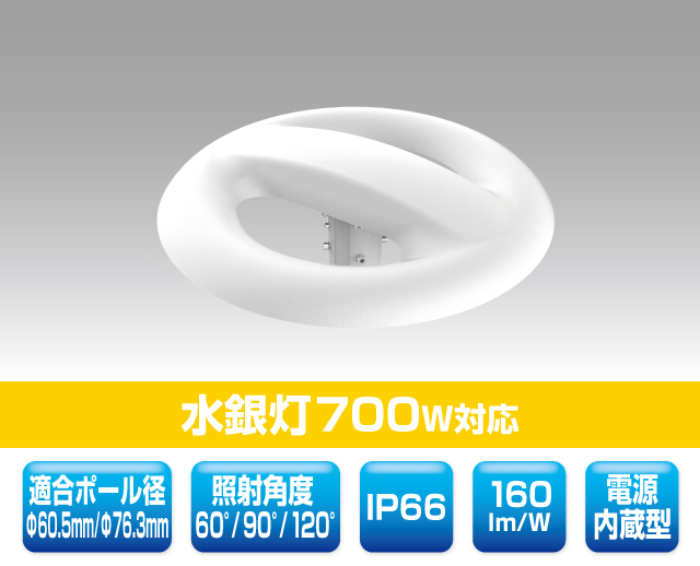 公園ポール灯対応LED照明 1703 最終更新日時 : ミヤデン 公園ポール灯対応LED照明 品番:YRS100W-PKC-C 製品仕様 ● N:昼白色 YRS100W-PKC-C/N 消費電力 : 100 W入力電圧 : AC 100 ~ 240 Vサイズ : φ 380 × 162 mm質量 : 4.1 kg設計寿命 : 50,000 h色温度 : ●N 5,000K演色性 : Ra80使用温度 : -40 ~ 60°C保護等級 : IP66照射角度 : 60° / 90° / 120°全光束参考値: ●N 16,000 lm適合ポール径: φ 60.5 mm φ 76.3 mm製品保証 : 5 年 製品仕様書 株式会社ユアーズ・トレード「製品情報」、https:www.yrstrade.com/prodacts、(参照 2025-11)