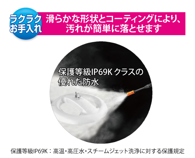 水蒸気対応型LED照明 2005 最終更新日時 : ミヤデン 特殊用途向けLED照明 品番:YRS200W-STM-C 製品仕様 ● N:昼白色 YRS200W-STM-C/N 消費電力 : 200 W入力電圧 : AC 100 ~ 240 Vサイズ : φ 500 × 68 mm質量 : 5.6 kg設計寿命 : 50,000 h色温度 : ●N 5,000K演色性 : Ra80使用温度 : -40 ~ 55°C保護等級 : IP69K照射角度 : 60° / 90° / 120°全光束参考値: ●N 32,000 lm製品保証 : 5 年 製品仕様書 株式会社ユアーズ・トレード「製品情報」、https:www.yrstrade.com/prodacts、(参照 2025-11)