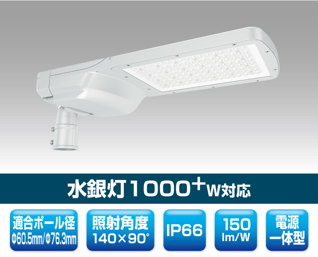 街路灯・道路灯対応LED照明 1616 最終更新日時 : ミヤデン 街路灯・道路灯対応LED照明 品番:YRS240W-STS-Z 製品仕様 ST-S series ● N:昼白色 YRS240W-STS-Z/N 消費電力 : 240 W入力電圧 : AC 100 ~ 240 Vサイズ : 762 × 290 × 143 mm質量 : 8.1 kg設計寿命 : 50,000 h色温度 : ●N 5,000K演色性 : Ra70使用温度 : -40 ~ 50°C配光角度 : 140 × 90°全光束参考値: ●N 36,000 lmフロントカバー: 耐衝撃性保護ガラス(IK10)雷サージ : 10 KV適合ポール径: φ 60.5 mm φ 76.3 mm ※ご注文時にご指定ください。製品保証 : 5 年 製品仕様書 株式会社ユアーズ・トレード「製品情報」、https:www.yrstrade.com/prodacts、(参照 2025-11)