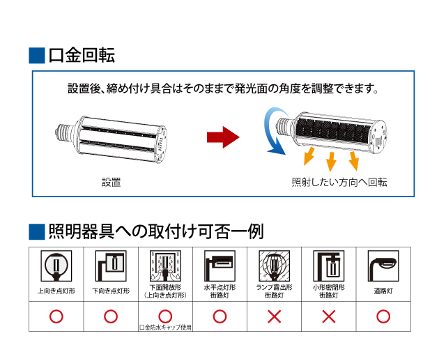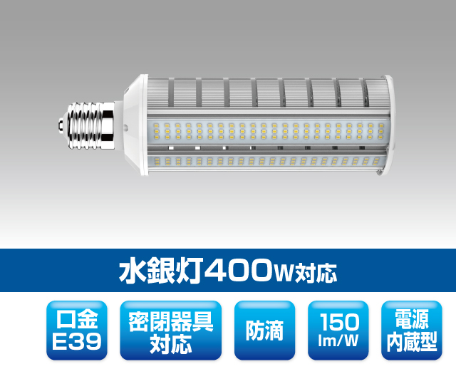 街路灯・道路灯対応LED電球 1503 最終更新日時 : ミヤデン 街路灯・道路灯対応LED電球 品番:YRS60W-RB180-G 製品仕様 RB180 series ● N:昼白色 YRS60W-RB180-G/N 消費電力 : 60 W入力電圧 : AC 100 ~ 240 V入力電流 : 0.67 A / 100 V 0.33 A / 200 V対応口金 : E39サイズ : 79 × 92 × 275 mm質量 : 1,020 g設計寿命 : 40,000 h色温度 : ●N 5,000K演色性 : Ra80使用温度 : -30 ~ 45°C保護等級 : IP64(口金部分除く)全光束参考値: ●N 9,000 lm ± 200 lm製品保証 : 5 年 製品仕様書 株式会社ユアーズ・トレード「製品情報」、https:www.yrstrade.com/prodacts、(参照 2025-11)